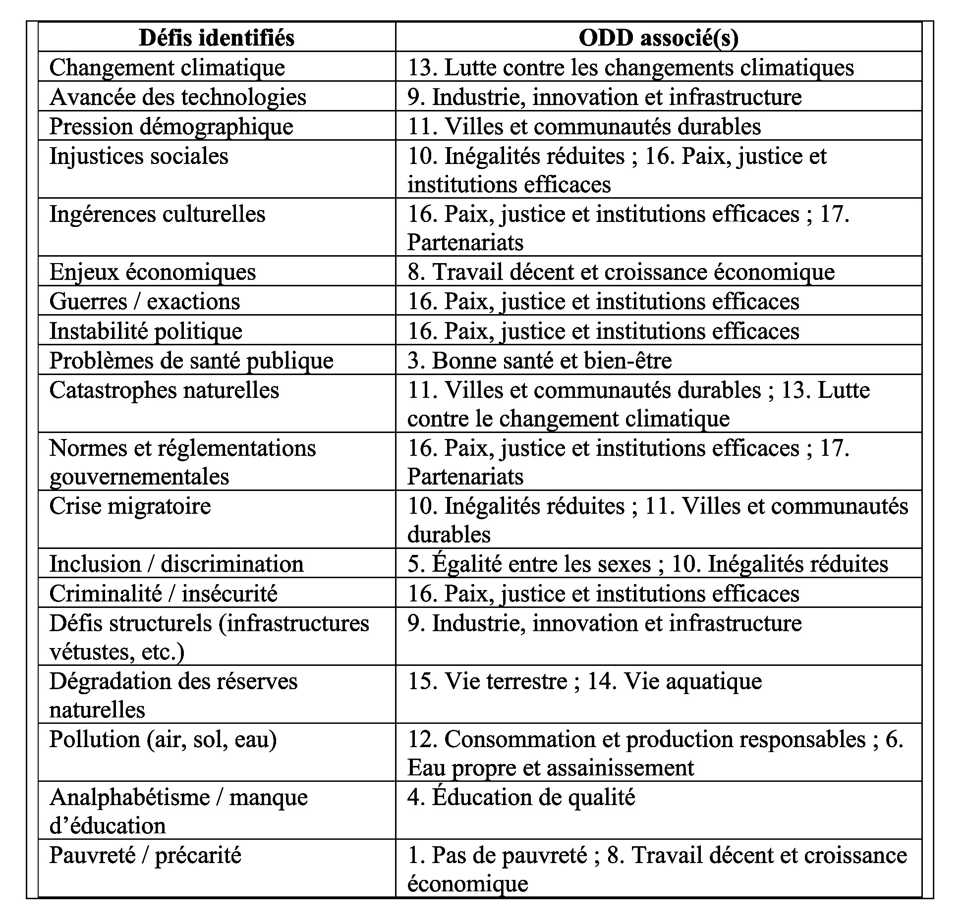 Dans une démarche pédagogique et analytique, ces défis ont ensuite été mis en relation avec les 17 Objectifs de Développement Durable (ODD) adoptés par les Nations Unies dans le cadre de l’Agenda 2030. Cette mise en parallèle, réalisée sous la forme d’un tableau, a permis d’établir des liens concrets entre les préoccupations architecturales actuelles et les enjeux globaux de développement durable.