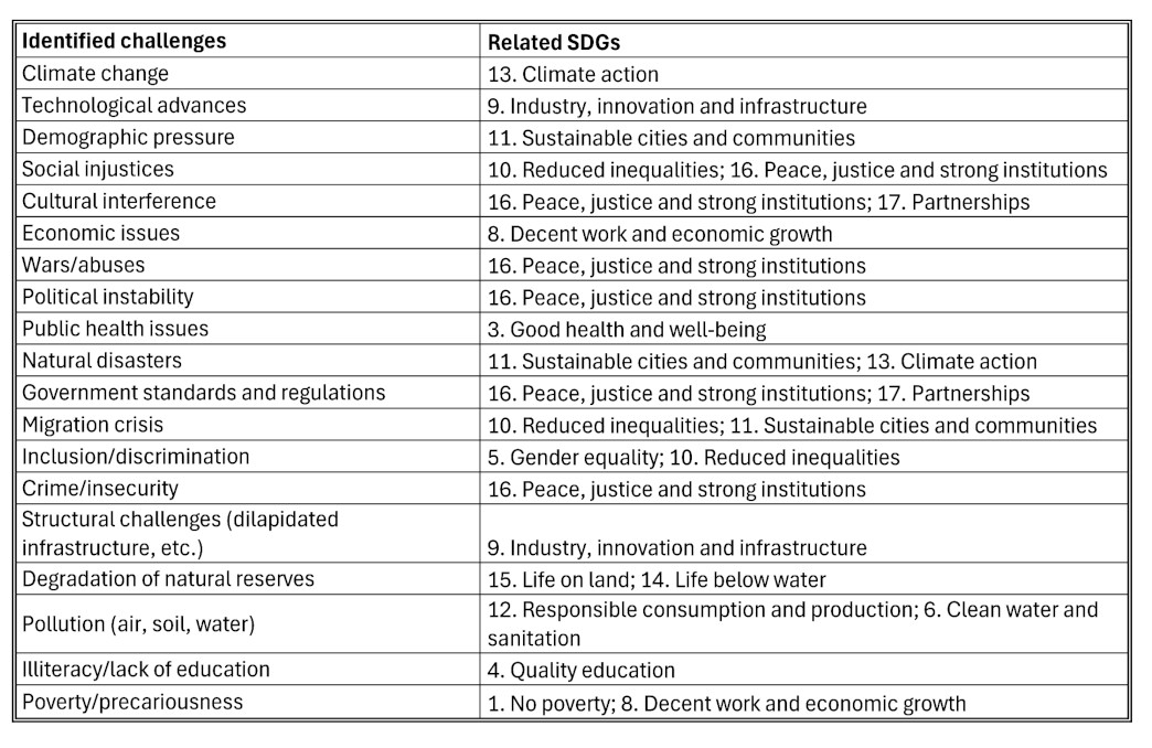 In an educational and analytical approach, these challenges were then linked to the 17 Sustainable Development Goals (SDGs) adopted by the United Nations as part of the 2030 Agenda. This comparison, presented in the form of a table, made it possible to establish concrete links between current architectural concerns and global sustainable development issues.